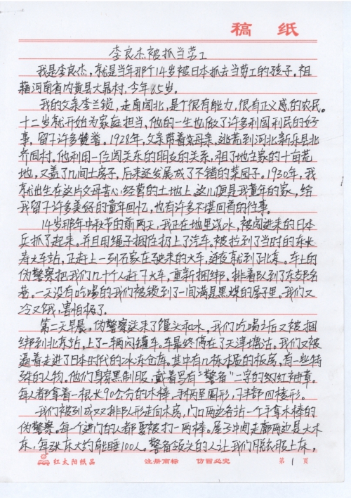 我是李良杰,就是当年那个14岁被日本抓去当劳工的孩子。祖籍河南省内黄县大晁村,今年65岁。