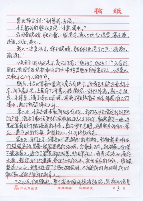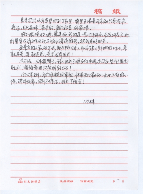 细节:1930年我出生在北京,14岁那年被突然闯进我家的日本兵抓起来仍在汽车上。同时抓来的还有几十人,我们被日本兵押送到了日本做劳工,吃的饭都是馊的但是确实很饿就狼吞虎咽的吃下去,结果不到3天大肠发炎,尿血,苦不堪言。在做劳工的日子里几次都差一点死亡。后来在菜地里挖野菜吃被日本兵发现,他们带着洋狗追赶我,前面是悬崖我无路可走,更是知道被抓回去的后果想到这里我纵身一跳跳进了大海,游了不知道多久精疲力尽昏了过去。当我醒来的时候看到一家日本母女原来是他们救了我,这和那些日本人形成了太大的鲜明对比。备注亲自到童增那里送的信,没有信封。