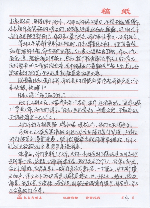 第五天,我们上了一艘名叫“黑潮丸”的轮船。轮船载着难友们缓缓启动,冒着一股股黑色的浓烟,扩散到天空,到海面。吞噬了碧海蓝天,遮住了原本美丽的风景。站在甲板上,看着波涛汹涌的大海,想想我们的遭遇,牵挂故乡的父母,担忧国家的命运。一股酸楚涌上心头,我禁不住流下了伤心的眼泪。不知道何时能回国,何时能回家,还能不能再见到亲人。