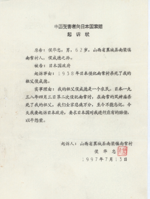 细节:1938年日军侵犯我的家乡,在庙里杀死了我的祖父,今天我要起诉日本政府,要求日本国对我进行赔偿,另寄上证明材料。备注信封丢失