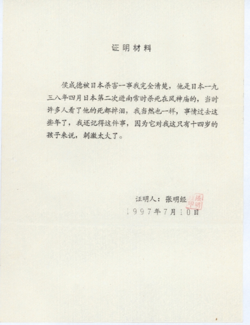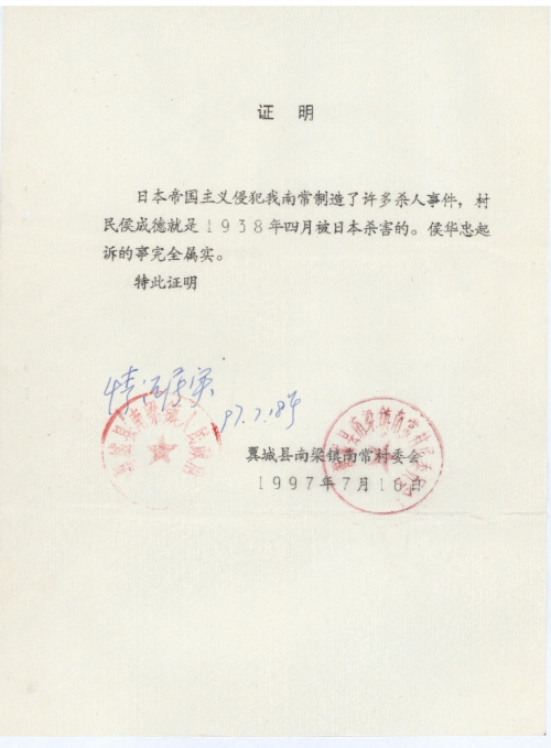 日本帝国主义侵犯我南常制造了许多杀人事件,村民侯成德就是1938年四月被日本杀害的。侯华忠起诉的事完全属实。