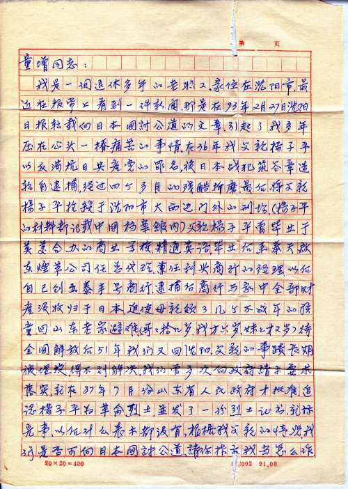 我是一个退休多年的老职工。家住在沈阳市,最近在报纸上看到一件新闻,那是在93年2月27日沈阳日报转载向日本国讨公道的文章,引起了我多年压在心头一桩痛苦的事情。在36年我父亲杨子平以反满抗日共产党的罪名,被日本战犯筑谷章造亲自逮捕,经过四个多月的残酷折磨,最后将父亲杨子平枪杀于沈阳市大西边门外的刑场。(杨子平的材料都记载中国档案馆内)父亲杨子平曾毕业于英美合办的商业学校,精通英语。毕业后来奉天启东烟草公司任总代理,兼任利兴商行的经理。此后自己创立泰丰号商行,逮捕后商行与家中全部财产没收归于日本,迫使母亲领了几个不成年的孩童,回山东老家避难。(哥哥十几岁,我才六岁,妹妹才2岁)待全国解放后,51年我们又回沈阳,父亲的事迹长期被埋没,得不到解决。我们曾多次向政府请示要求落实,就在87年7月份山东省人民政府才批准,追认杨子平为革命烈士,并发了一份烈士证书,就算完事。以后什么表示都没有,根据我父亲的情况,我们是否可向日本国讨公道,请你指示我当怎么[做]。盼速回信。