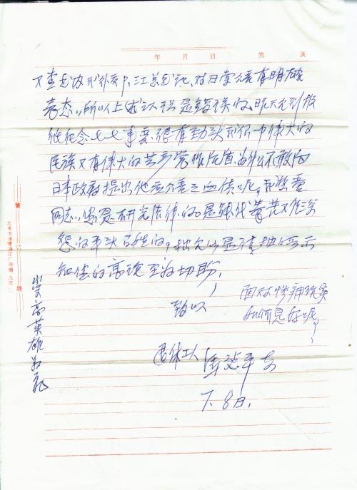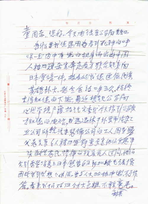 为什么要找您是因为看到死神的呼唤一书内有您的挺身而出为中国人被日寇杀害奔走各方联合起来向日本索赔一件。故各处找您这位民族英雄北大老[龄]会的二年之久,始终未得知您的下落,最近想起公安局必然掌握户籍,故托它查找,今天接到公安信,才知您的电话,我是退休于北京市汽车工业公司所辖汽车装饰公司的工人,因我舅父表兄共6人被日军野蛮杀害他们全是平头百姓农民,惨痛的现实无人过问,他们见到参考消息上日本慰安妇新加坡也赔偿,因此找到我想想办法,曾与人大,政协申述,不予作答。看来我们对日财大气粗、不敢动其毫毛。又查出内务外交部江总出面,对日索赔有明确表态,所以上述认识是错误的。昨天见到报纸纪念七七事变,很有劲头。我们一个伟大的民族又有伟大的共产党[做]后盾。为什么不敢向日本政府提出他应赔之血债呢。我想童同志,您是研究法律的,是能代表苦难深怨的平头百姓的。拙见如是,请抽的抽暇示知您的高论至为切盼。