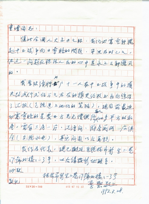 我曾陆续将七户十一人在中日战争中的损失约贰仟贰佰万元左右的损失约数书面向您作了汇报(包括送上他们的笔迹),现目前最迫切需索赔的是要日方先无偿供给每人100多平方的私房,需有三房一厅、洗澡间、厨房、厕所一应俱有(包括水电),其他问题以后再说。