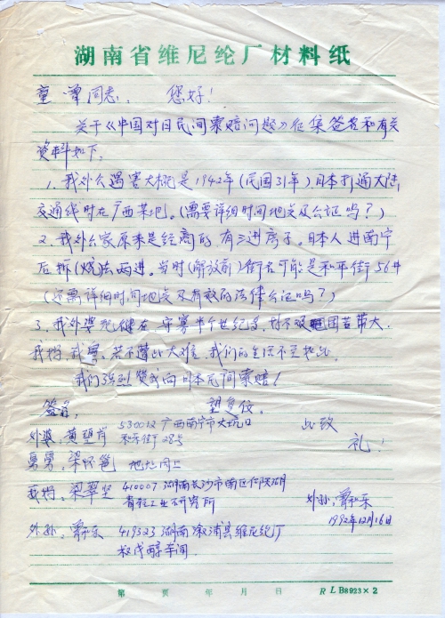细节:1942年日本打通大陆交通线时在广西某地把我外公家的房子烧去两间,外公是经商的。我们强烈要求日本赔偿我们的损失,附上家属签名。