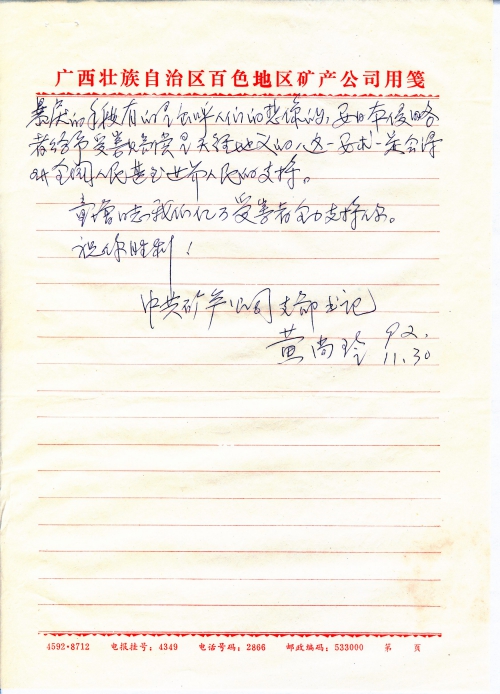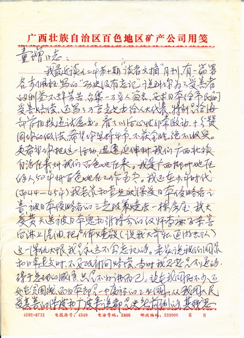 我最近读九二年第十期“读者文摘”月刊,有一篇署名李佩钰写的“历史没有忘记”说到你为了受害者的利益不辞劳苦,召集一万多人签名,要求日本给予民间受害赔偿,还写了万言意见书给人大代表,特别是给海部首相投递请愿书。看了以后心情非常激动,十分赞同你的做法,希望你坚持斗争,不获全胜绝不收兵。更希望你把这一活动迅速延伸到我们广西壮族自治区来,到我们白色地区来。我是广西柳州地区的人,50年到白色地区工作至今。我还在少年时代(即44-45年)我老家和堂兄就深受日本侵略者之害,被日本侵略者的三光政策烧去一栋房屋。我大哥黄天送被日本鬼和维持会的汉奸李麻子杀害后淋上汽油,把尸体烧毁(说我大哥私通游击队)。这一深仇大恨我是永远不会忘记的。老实说我们国家和日本建交时,不要政府间赔偿,当时我思想是不通的。碍于总理的威信,只是不好讲而已。现在我国民不少还处在贫困线,而日本却是一个富裕的工业国。从我国人民受其害的深度和广度来说都是史无前例的,其残忍暴戾的手段有的是出呼(“呼”编辑为“乎”)人们想像(“像”编辑为“象”)的,要日本侵略者给予受害赔偿是天经地义的。这一要求一定会得到全国人们甚至世界人民的支持。