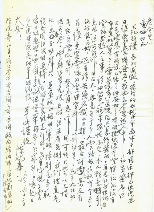大札拜读,甚为感激。据我所知,杭州市离休干部俱乐部已组织过日侵受害索赔签名。我也在少量熟人中动员签名,但不甚理想。有的说:“不赔了,讲友好了”,有的讲报纸没有宣传,组织没有布置,如此等等。当然说清道理后还是愿意签的。再是让我组织索赔发起人之事,请研究中心领导按情况定。本人愿意“滥竽充数”,但可能作用不大。再是关于个人索赔数,建议有个参改标准为好。还有请告签名截止日期,最后可否寄点有关日侵受害索赔的宣传资料,以利动员。还有如能动员民主党派报刊等点消息,作用可能大些。以上均供参考。索赔任务是艰巨的,但世有先例,我们理直气壮,只要发动群众,并采取正确的策略,特别是争取联合国组织的支持,目的是定能达到的。只有实现了索赔,才能逼使日军国主义真正承认侵华战争的罪行,唤起日本人民对侵略战争的仇恨。
