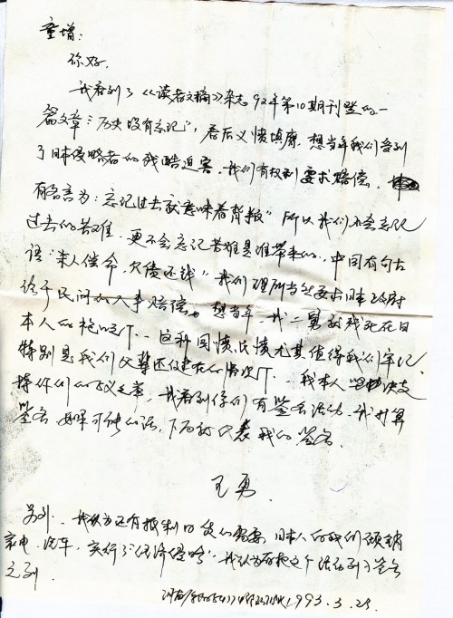 我看到了《读者文摘》杂志92年第10期刊登的一篇文章“历史没有忘记”,看后义愤填膺。想当年我们受到了日本侵略者的残酷迫害,我们有权利要求赔偿。有名言为“忘记过去就意味着背叛”,所以我们不会忘记过去的苦难,更不会忘记苦难是谁带来的。中国有句古语“杀人偿命,欠债还钱”,我们理所当然要求日本政府给予民间的人事赔偿。想当年,我二舅就残死在日本人的枪口之下。这种国愤、民愤尤其值得我们牢记,特别是我们父辈还健在的情况下,我本人坚决支持你们的正义之举,我看到你们有签名活动,我打算签名,如果可能的话,下面就代表我的签名。