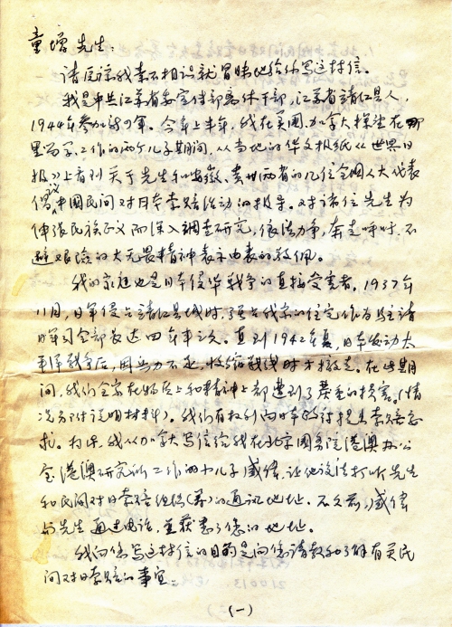 我是中共江苏省委宣传部离休干部,江苏省靖江县人,1944年参加新四军。今年上半年,我在美国、加拿大探望在那里留学、工作的两个儿子期间,从当地的华文报纸《世界日报》上看到关于先生和安徽、贵州两省的几位全国人大代表倡议中国民间对日索赔活动的报导。对诸位先生为伸张民族正义而深入调查研究,依法力争,奔走呼吁,不避艰险的大无畏精神表示由衷的敬佩。