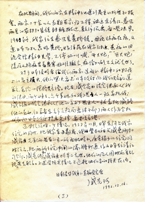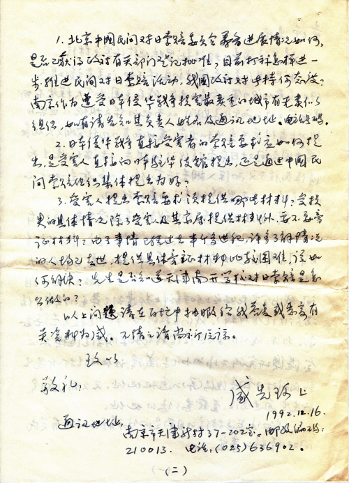 我的家庭也是日本侵华战争的直接受害者。1937年11月,日军侵占靖江县城时,强占我家的住宅作为驻靖日军司令部长达四年半之久。直到1942年夏,日本发动太平洋战争后,因兵力不足,收缩战线时才撤走。在此期间,我们全家在物质上和精神上都遭到了严重的损害(情况另附说明材料)。我们有权利向日本政府提出索赔要求。为此,我从加拿大写信给我在北京国务院港澳办公宝港澳研究所工作的小儿子盛伟,让他设法打听先生和民间对日索赔组织(筹)的通讯地址。不久前,盛伟与先生通过电话,并获悉了您的地址。
