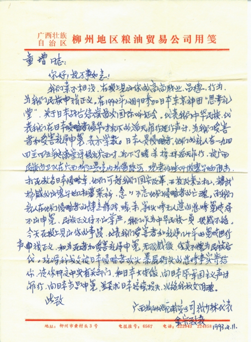 我们素不相[识],在报上见到你的高尚职业、品德、行为,为我们民族[伸]张正义。在1992年12月9日参加日本东京神田“思考礼堂”,关于日本战后赔偿首次国际听证会。代表我们中华民族,代表我们在日本侵略者侵华时犯下的滔天罪行进行声讨,为我们受害者和受害亲属申冤,表示崇敬。日本人是侵略者,他们的亲人在一九四四至四五年远离崇洋侵犯广西时,犯下了烧、杀、掳、掠、滔天罪行,被广西民族自卫队在广西柳江县境内柳邕路段,现老[百]姓叫做鬼子坳阻击,打死数名日本侵略军,他们可趁我们国家改革开放政策之机,耀武扬威的到鬼子坳扫墓祭祀,念念不忘他们侵略者的亡魂。而我们亲人在他们侵略者的肆意摧残,烧、杀、割头惨无人道的悲惨冤情得不到申冤,民族正义得不到尊严,我们作为中华民族一员,很感不铬。今天在报纸上见到你的事迹,代表我们受害者和亲属几十年的冤情进行[伸]张正义,和为死者和受害亲属申冤,无限感激,你真不愧为民族后代。现将我叔父被日本侵略者砍头,暴尸街头的悲惨事实寄给你,请你转交中央有关部门,和日本大使馆,向日本原军国主义声讨罪行,向日本当局申冤,并要求日本赔偿损失,以铬我叔父阴魂。