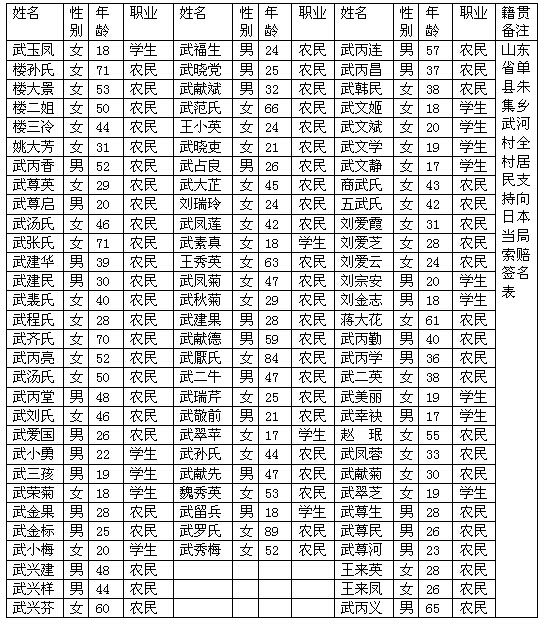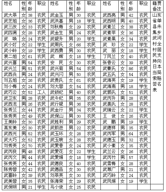 21 10 月, 2018 s0872 Share EmailTwitterFacebookGoogle +PinterestTumblrLinkedinVkontakte English 信扫描序列号:s0872 写信日期:1993-04-30 写信地址:山东省菏泽市单县 受害日期:信中未提 受害地址:山东省菏泽市单县 写信人:多人 受害人:多人 类别:其它(OT) 细节:寄来两份“抗日战争时期日军毁坏中国和平居民财产统计表”的受害人签名。 抗日战争期间日军毁坏中国和平居民生命财产统计与中国人民支持索赔签名表 抗日战争期间日军毁坏中国和平居民生命财产统计与中国人民支持索赔签名表 21 10 月, 2018 10000cfj_3o5som 其它(OT)