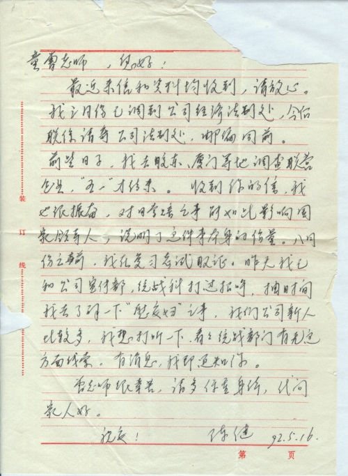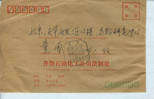 最近来信和资料均收到,请放心。我三月份已调到公司经济法制处,今后联系请寄公司法制处,邮编同前。前些日子,我去胶东、厦门等地调查联营企业,“五一”才结束。收到你的信,我也很振奋,对日索赔之事能如此影响国家领导人,说明了这件事本身的份量。八月份之前,我在复习考试取证。昨天我已和公司宣传部、统战部打过招呼,抽时间我去了解一下“慰安妇”之事。我们公司新人比较多,我想打听一下,看看统战部门有无这方面线索。有消息,我即通知你。