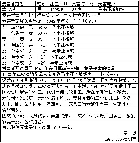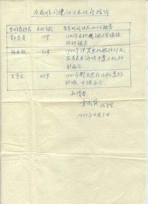 细节:寄上友人的受害材料,在十八名受害同胞中有三位是我认识的,分别死于日本的飞机轰炸和残忍的杀害。另附上“向日本政府要求受害损失赔偿表”