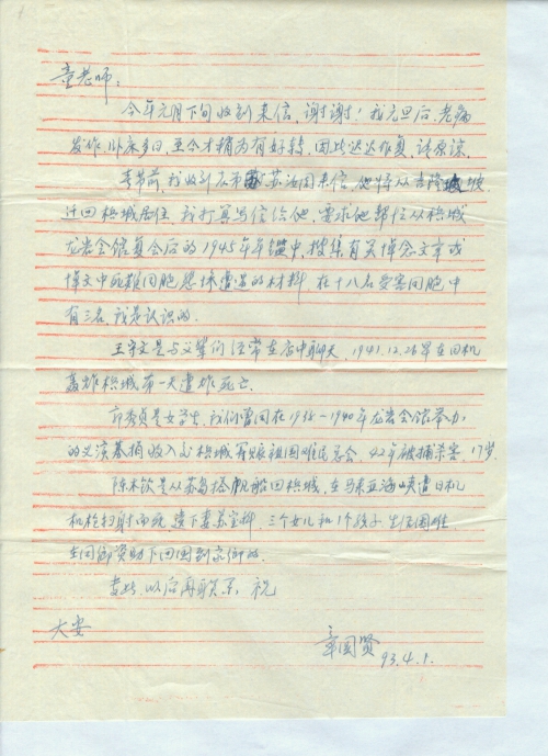 春节前,我收到表弟苏汝周来信。他将从吉隆坡迁回槟城居住。我打算写信给他,要求他帮忙从槟城龙岩会馆复会后的1945年年[鉴]中搜集有关悼念文章或悼文中死难同胞悲惨遭遇的材料。在十八名受害同胞中有三名我是认识的。
