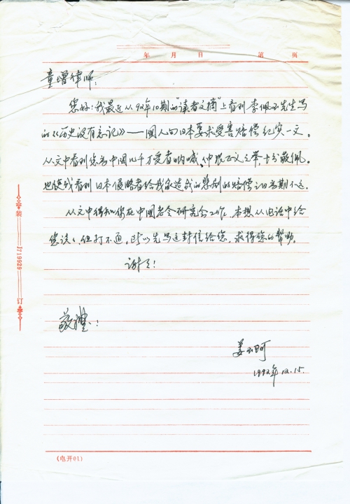 我最近从92年10期的“读者文摘”上看到李佩玉先生写的《历史没有忘记》——国人向日本要求受害赔偿纪实一文。从文中看到您为了中国几千万受[害]者呐喊、伸张正义之举,十分敬佩。也使我看到日本侵略者给我家造成的悲剧的赔偿之日为期不远。