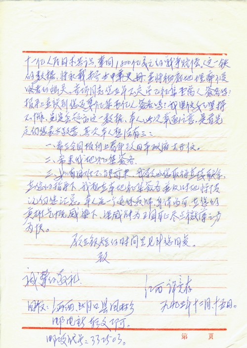 三、如有困难不能前来,我愿与您取得直接联系,在您的指导下,我想在本地征集签名,并及时地将情况向您汇总。本人是一个退休教师,身体尚可,在您的英雄气概感染下,深感能为清国耻尽点微薄之力为快。