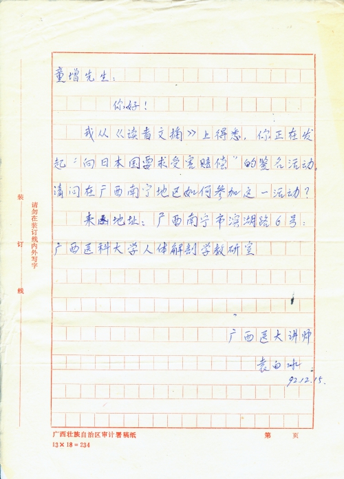21 10 月, 2018 s0888 Share EmailTwitterFacebookGoogle +PinterestTumblrLinkedinVkontakte 信扫描序列号:s0888 写信日期:1992-12-15 写信地址:广西省南宁市 受害日期:无 受害地址:无 写信人:袁白冰 受害人:无 类别:其它(OT) 细节:看到您提出提出的签名活动,如何参加? 童增先生: 你好! 我从《读者文摘》上得悉,你正在发起“向日本国要求受害赔偿”的[签]名活动。请问广西南宁地区如何参加这一活动? 来函地址:广西南宁市滨湖路6号:广西医科大学人体解剖学教研室 广西医大讲师 袁白冰 92.12.15 21 10 月, 2018 10000cfj_3o5som 其它(OT)