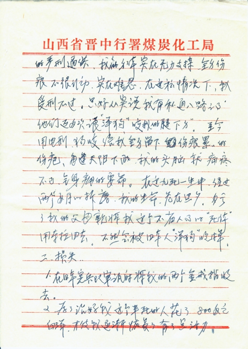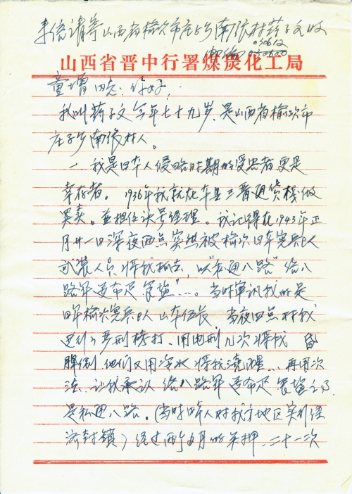 一、我是日本人侵略时期的受害者,更是幸存者。1936年我就在本县三晋通货栈做买卖,并担任该号经理。我记得在1943年正月二十一日深夜两点,突然被榆次日本宪兵队武装人员将我抓去,以“私通八路”给八路军送布匹食盐……当时审讯我的是日军榆次宪兵队山本伍长。当夜四点对我进行了严刑拷打,用电刑几次将我昏倒。他们又用冷水将我浇醒,再用次法,让我承认给八路军送布匹、食盐之事,是私通八路。(当时日本人对我方地区实行经济封锁)经过两个多月的关押,二十一次的严刑逼供,我的身体实在无力支持,全身伤痕不很行动,实在难忍。在这种情况下,我受刑不过,只好从实说我有私通八路之事。他们还多次让“洋狗”咬我的腿下身。至今用电刑、狗咬给我全身留下伤痕累累的伤疤,每逢天阴下雨,我的头脑就疼痛不已,全身痛得要命。在这九死一生中,经过两个多月的折磨,我的生命危在旦夕,多亏了我的父母亲将我这个不省人事的“死体”用车拉回去。不然会被日本人“洋狗”吃掉。