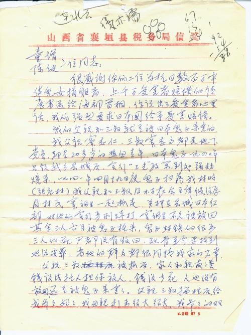 Other details:I thank you for speaking out what’s on the victims’ mind and I strongly urge compensation from the Japanese. In 1940 the Japanese occupied the Wuxiang County and practiced the notorious “Burn All, Kill All, Loot All” policy. My father Dou Zhirene and uncle Dou Zhigao and other two villagers were caught by the Japanese on April 19, 1941. Later one of them was released, while my father, uncle, and chairman of the village farming committee were killed. We were even not allowed to take away the bodies.
