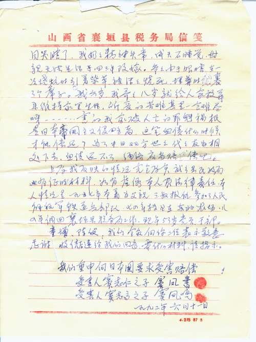 I’d like to thank you for delivering the petitions of millions of Chinese people who sacrificed their lives in the war of resistance against Japan, and the petitions of tens of millions of victims to Prime Minister Kaifu and for speaking up for the victims. We strongly demand damage compensation from Japan.