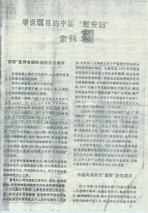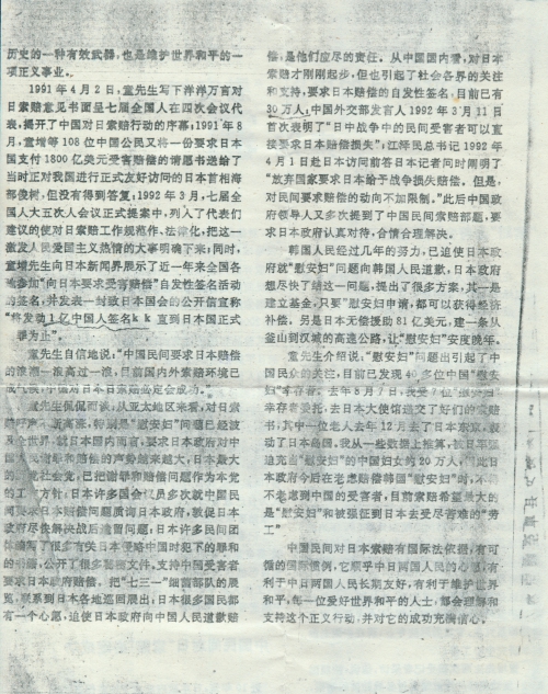 童先生介绍说:“慰安妇”问题出引起了中国民众的关注,目前已发现40多位中国“慰安妇”幸存者。去年8月7日,我受7位“慰安妇”幸存者委托,去日本大使馆递交了[她]们的索赔书,其中一位老人去年12月去了日本东京,轰动了日本岛国。我从一些数据上推算,被日军强迫充当“慰安妇”的中国妇女约20万人,因此日本政府今后在考虑赔偿韩国“慰安妇”时,不得不考虑到中国的受害者,目前索赔希望最大的是“慰安妇”和被强征到日本去受尽苦难的“劳工”