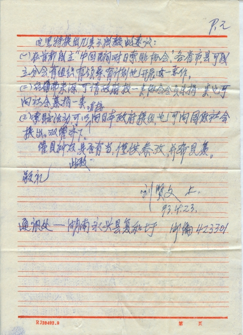 解放后,周恩来总理为了换取日本的承认,随便答应放弃对日本索赔的要求。周总理的这一承诺,只是放弃战争赔偿,而不包含受害赔偿在内。我们现在提出受害赔偿,完全是正义的,理直气壮的,一定可以得到全世界反对侵略、爱好和平的人民所理解和支持的。如有必要,我愿为这一工作贡献我的余年。