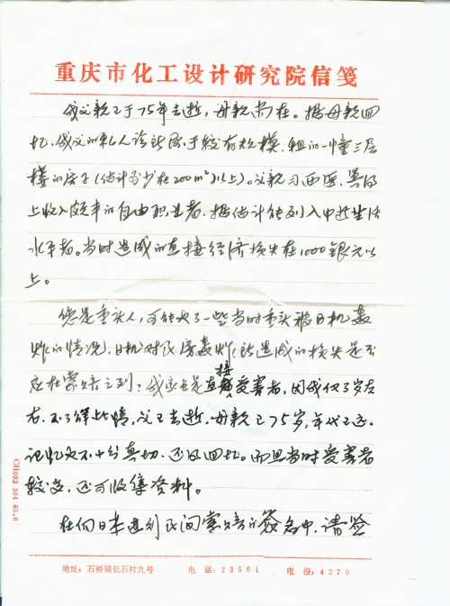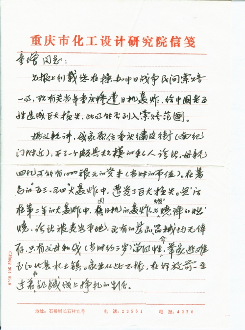 您是重庆人,可能也了解一些当时重庆被日机轰炸的情况。日机对民房轰炸,所造成的损失是否应在索赔之列?我家虽是直接受害者,因我仅3岁左右,不了解此情,父已去[世],母亲已75岁,年代已远,记忆也不十分真切,还得回忆。而且当时受害者较多,还可收集资料。