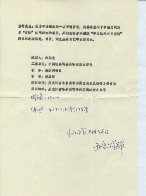 童增先生:[作]为中国东北的一名普通百姓,我非常热心于中国民间对日“索赔”这项伟大的事业,并欲在哈尔滨组建“中国民间对日索赔”同盟东北联络处。当否,请先生在百忙中回信指教。