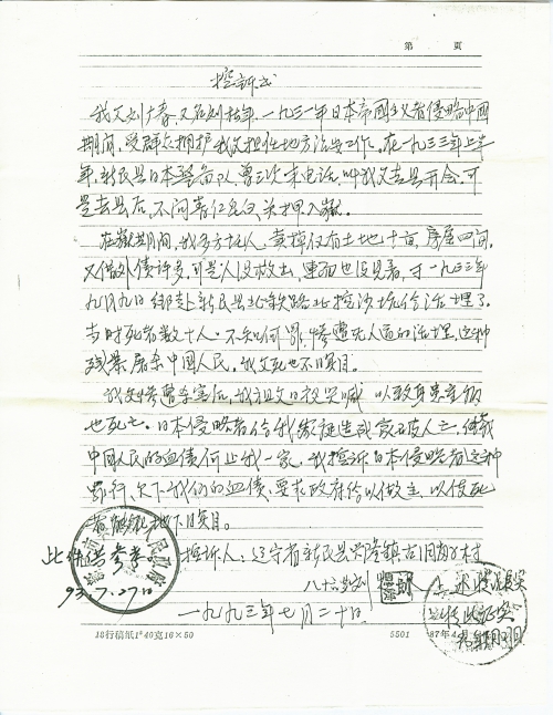 六十年已[经]过去,我们家受着亲人被害的痛苦。为了世界永久和平,为了中日两国人民世世代代友好相处,我受我大哥刘恩泽的委托,把他的控诉书和当年亲身经历此事的80岁以上的老人郭永厚、赵广风的证明材料复印件一起给您寄去,请收阅。