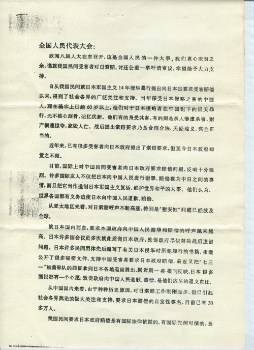 欣闻八届人大在京召开,这是全国人民的一件大事,我们衷心庆贺之余,谨就我国民间受害者对日索赔、讨还公道一事吁请审议,幸望给予大力支持。