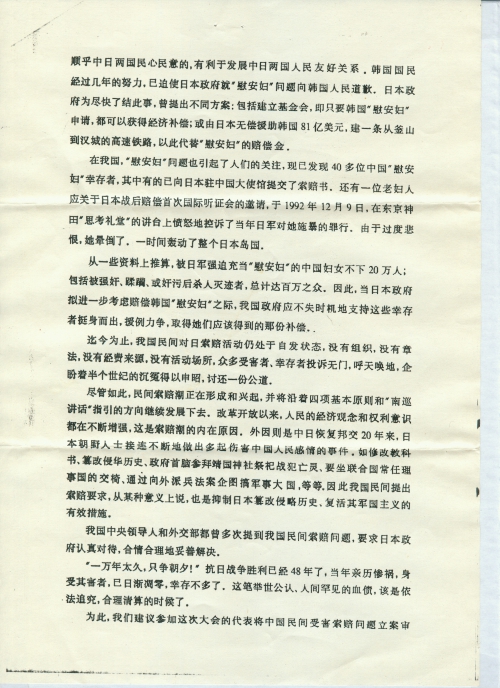 从一些资料上推算,被日军强迫充当“慰安妇”的中国妇女不下20万;包括被强奸、蹂躏、或奸污后杀人灭迹者,总计达百万之众。因此,当日本政府拟进一步考虑赔偿韩国“慰安妇”之际,我国政府应不失时机地支持这些幸存者挺身而出,援例力争,取得她们应该得到的那份补偿。