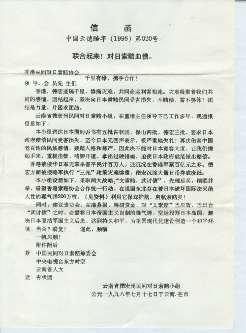 香港、德宏遥隔千里,惨痛灾难,共同命运利害相连。灾难凝聚着我们共同的情感,团结起来,坚决向日本索赔民间受害损失,不赔偿,誓不罢休!团结就是力量,片函求团结。