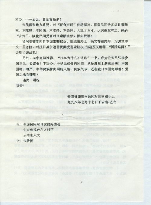本小组送达日本国起诉书有五匹告状团,保山两批,德宏三批,要求日本政府赔偿民间受害损失,至今日本无回声表示,极严重地失礼!再次伤害中国老百姓的民族感情,践踏人格和尊严,因此决不能对日本宽宏大度,让我们携起手来,重槌击鼓,鸣锣开道,拿出过硬措施,迫使日本政府就范作出赔偿。