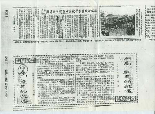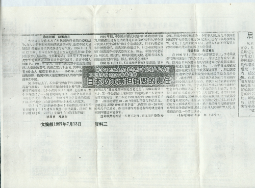 细节:我们要联合起来共同索赔。信中寄来日本在中国遗留毒气弹的报道复印件,题目是“日本必须承担销毁的责任”。