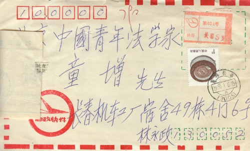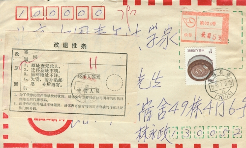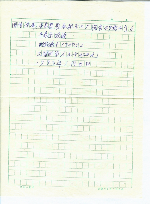 回信请寄:吉林省长春机车工厂宿舍49栋4门6号朱永政收