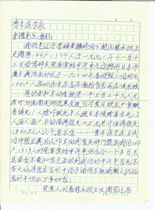 我们是辽宁省岫岩县岭沟乡村民林永政,王文阁等164户1339人,于一九九二年十一月十三日给您邮去受害索赔申诉书一份,控诉日本帝国主义治安部队于一九三四年春,烧毁三个村屯,164户人家的房屋、家畜、家禽、粮食、农具、家具、衣被……等动产和不动产,致使一千三百三十九人无家可归,流离失所,饥寒交迫,乞讨度日,缺衣少食,缺食饿死一人,惊吓致死8人,被日本侵略军杀死13人。每人每户平均经济损失10万元,共计经济损失1860万元人民币。要求您——青年法学家为我们伸张正义,为民[做]主,向我有关部门提出,我们164户,1339人的受害索赔申诉书。但迄今一个多月,未见回音,不知您是否收到?我们的申诉书,有无不当之处?请您在百忙之中,给予回信,不胜感激之,祝福您新年快乐,万事如意!