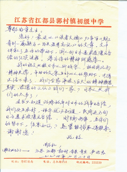 最近从《读者文摘》92年第10期上看到一篇题为《历史没有忘记》的文章。文中讲叙了再你的带动下,国人向日本要求受害赔偿的纪实过程。深为你的精神所感染。