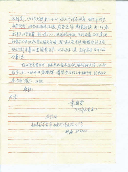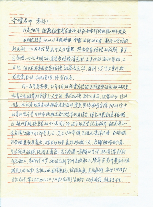 我一家是受害者。92年9月3日我曾写信给正将来华访问的日本天皇,邮寄日本驻华大使馆交天皇的,要求赔偿,至今已半年,没有回音。信的内容,也就是我家在日本南侵东南亚时,遭受悲惨苦难实情。附此信中的复印照片是1945年梹城龙岩会馆举行追悼会,悼念日军南侵梹城后,被日军残酷杀害的十八名同乡所设立的灵堂纪念相片。被害者之一章应淇(右联下方)即是先父。先父1920年随先祖父漂洋过海,在梹城经营碗盘食具商店,日军发动战争,轰炸梹城三天,店铺被炸倒塌,生活顿失依持,经济无着落,先父为谋一家糊口生计,托同乡带我到印尼做工,当时我是15岁。他自己到星洲去做职员,次年在星洲遭到日军残杀(时36岁)。先祖父母闻得噩耗,惊忧成疾,先后病逝。家母(时33岁)生活无计,带了三个女儿(11、7、4岁)在同乡资助下,风餐雨宿,辗转千里,回到家乡。1953年我携妻、子、女从印尼回乡侍奉母亲。她今年85岁,每逢祭祖,她念及海外孤魂,痛哭流涕,悲愤欲绝,再三叮嘱要请灵归里安葬。我一家八口,因战乱所致,生别死离,三代遭殃。我要求日本政府偿还损失款项,我一家人赴星洲梹城迎请灵灰归回故乡安葬的盘缠费用等等,以尽为子之道。完却家母百年之后合葬之愿。