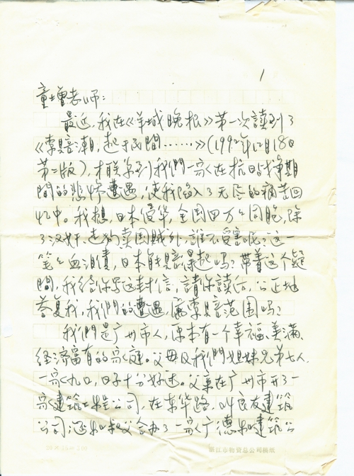 最近,我在《羊城晚报》第一次读到了《索赔潮,起于民间……》(1992年12月18日第二版),才联系到我们一家在抗日战争期间的悲惨遭遇,使我陷入了无尽的痛苦回忆中。我想,日本侵华,全国四万万同胞,除了汉奸、走狗、卖国贼外,谁不受害呢?这一笔笔血泪债,日本能赔得起吗?带着这个疑问,我给你写这封信,请你读后,公正地答复我,我们的遭遇属索赔范围吗?