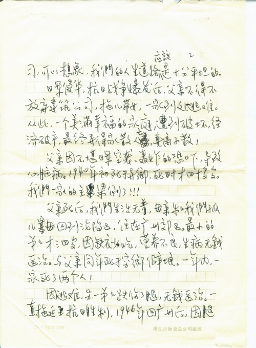 因逃难,另一弟弟跌伤了腿,无钱医治。一直拖延至抗日胜利,1946年回广州后,因腿伤骨枯,只好截肢,才十二岁,造成了终身残废,至今已58岁,仍未成家,孤身一人,晚年生活凄苦。