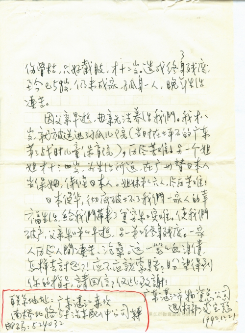 因父亲早逝,母亲无法养活我们。我才八岁,就被送进了孤儿院(当时在坪石的广东第三战时儿童保育院),历尽苦难!另一个姐姐才十三四岁,为生活所迫,在广州替日本人当保姆,伺候日本人。姐妹弟弟六人,尽历苦难!