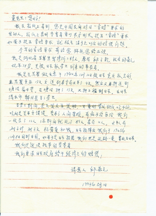 我在报纸上看到,您是中国民间对日“索赔”要求的发动人。报纸上表明受害者要以书面形式提出“索赔”要求,如果不提出索赔要求,就根本谈不上以后的赔偿问题。