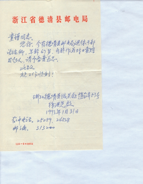 21 10 月, 2018 s0980 Share EmailTwitterFacebookGoogle +PinterestTumblrLinkedinVkontakte 信扫描序列号:s0980 写信日期:1993-01-31 写信地址:浙江省湖州市德清县 受害日期:无 受害地址:无 写信人:徐继尧 受害人:无 类别:其它(OT) 细节:我是退休干部,愿意做对日索赔发起人。 童增同志: 您好! 今有德清县邮电局退休干部谢岳卿,年龄67岁,自愿作为对日索赔发起人,请予备案为感。 此致 祝工作顺利! 浙江德清县城关镇赵家弄53号 徐继尧启 1993年1月31日 家中电话:25059、24528 邮编:313200 21 10 月, 2018 10000cfj_3o5som 其它(OT)