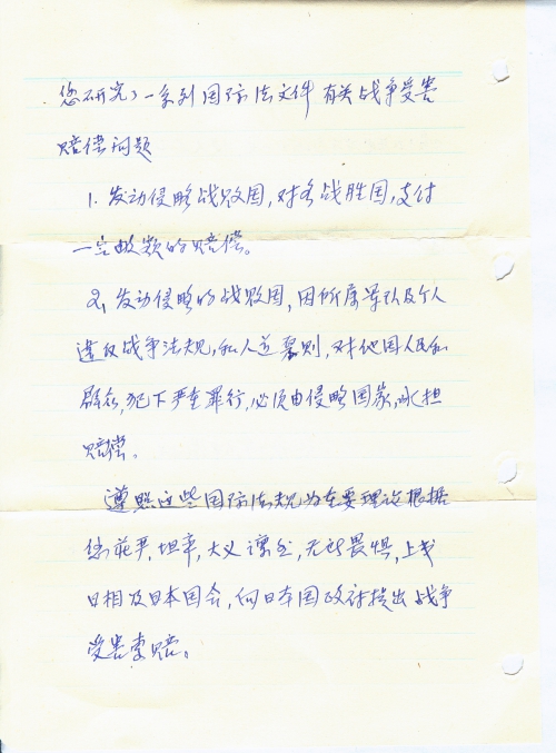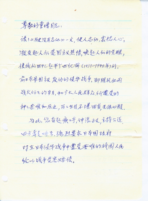遵照这些国际法规为重要理论根据,您庄严、坦率、大义凛然,无所畏惧,上书日相及日本国会,向日本国政府提出战争受害索赔。您的卓越胆识,豪迈气概,显示出伟大的中国人民威武不屈的顽强精神,令人钦佩。