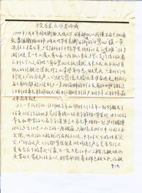 This is the third letter I’ve sent you, containing information about several tragic events that happened in my village. It is of true information with time and place provided for reference. Too many events like this happened in just a few months during the Hengyang’s occupancy. One can imagine the number of similar events that happened all over China during Japan’s 8-year invasion.