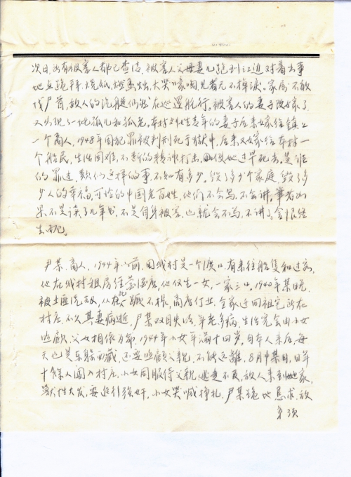 The next day, all the victims were identified. Their parents, wives and children cried and mourned for them by the riverside, making the onlookers shed tears. The relatives of the victims dared not find their corpses because the enemies were still patrolling in gas boats. Some of the wives of the victims remarried and a group of new orphans and elderly appeared. The wife of Liu XX from my village remarried a businessman from the town, who was sent to jail for crimes he committed in 1948 and died in prison. Then, she remarried again to a boatman from my village. She dies young from poverty and despair. There were a large number of similar cases like this. So many families were destroyed and so many people’s lives were ruined. Who was to blame? The poor Chinese people, they could neither write nor tell. If I hadn’t studied at school for several years, I wouldn’t be able to write either and could only live a life in hatred for the enemy.
