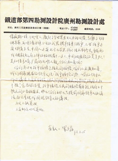 Right now, there are over 400,000 Chinese people signing to demand your government an apology and compensate civilian victims. It is a just request and the call of millions of Chinese people who were victimized, suffered and insulted. You Japanese people say “Chinese leaders once said to give up war reparations.” I’d like to ask whether you should make war reparations or not? What is the nature of the war? It is a war of aggression. The invaders are responsible for compensating the losses.