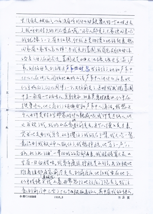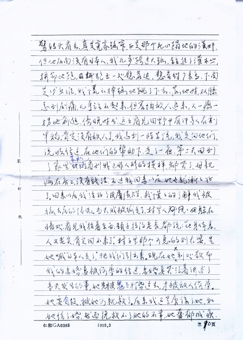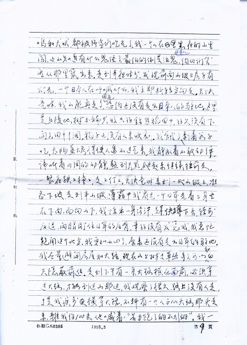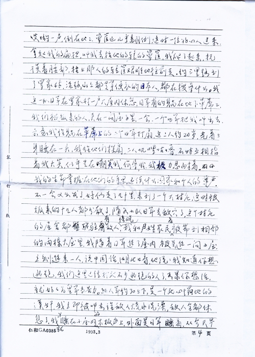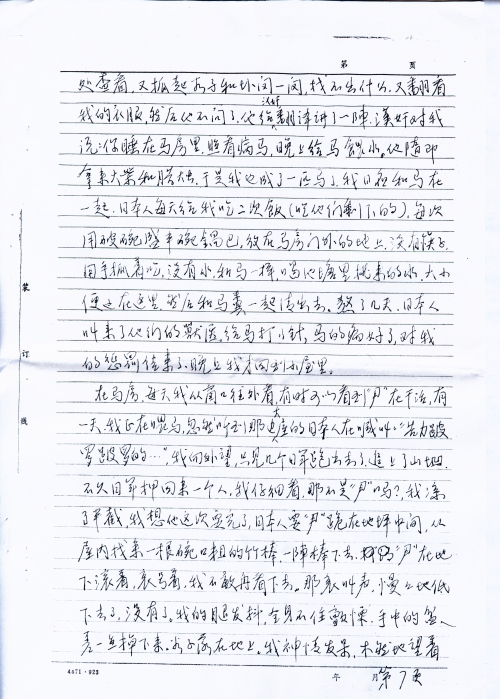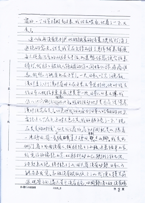 这以后再没有见到尹,他的被害的情景,使我打消了逃跑的念头,但是我实在支持不住了,身体越来越瘦,每天拖着沉重的双腿去干活,如果想休息,便会招来棒打。我腿上被敌人踢破的伤口开始化脓,疼痛难忍,我想可能要死在这里了。一天,日本人吃完了晚饭,汉奸来了,这个汉奸有时不在这里,不常见到他。他叫我去给日本人收拾餐桌、餐具,这是第一次,日本人从来不让我进入他们的活动休息的地方。我的活动地方是马房、洗澡房,汉奸说完后走了。从关押我的小屋到日本人吃饭的地方,要经过几个房子,这时天色已黑,我的脑子亮了一下,“现在是走的时候”。白天我已看好,房子对面就是山,隔着一片梯田,有一条小路,穿过梯田,可到达山脚。我走出侧门,看看外面没有人,拔腿跑上了小路,这条路并不长,我觉得好像跑不完,双腿抖动不已,跌倒了好几次,爬起来又跑,终于跑上山,回头看没有动静,日本人可能尚未发觉。总算没有被抓住,上了山我慢慢抹黑前进,观察方向,漫天星斗,没有月亮,四周静悄悄的,没有鸡鸣和犬吠,都被强盗们吃光了,我一个人在黑夜的山里闯,也不知道有什么鬼怪了,最怕的倒是活鬼日本人,怕他们突然从哪里窜出来,走到半夜时分,发现前面山坡上房子有灯光,一个日本人在叫喊什么,我立即折转方向走。天快亮时,我不能再走了,因为恐怕还没有走出日本人的驻地。这里是丘陵地,树木稀少,我只好钻进稻田中,好久没有下雨了,田中干涸,稻子也没有人来收割。我饿了剥着谷子吃,太阳蒸大[烤]的使人透不过气来,我静候着不敢动弹,[倾]听着四周的动静,熬到天黑,爬起来继续往前走,一整夜跌跌撞撞,走走停停,天快亮时来到一处山坡上,准备下坡,走到半山坡,薄雾中我看见一个日军光着上身坐在下面,面向山下,我惊出一身冷汗,赶快蹲下来,轻步后退,两眼盯住日军的后背,幸好没有发觉我,我急忙跑开这个地方,我更加小心了,原来还没有走出日军的驻地。我尽量避开房屋和大陆,现在山上树木草丛多了,可以在白天隐蔽前进。走到下午有一条大路横在面前,必须穿过大路,才能到达山那边,我观察了很久,路上没有人走,于是我疾步横穿大路,不料有一个人正从大路那头走来,离我约100米,他喊着:“苦力跑了的不行的。”我一惊转头看去,真是冤家路窄,正是那个死心塌地的汉奸,但他后面没有日本人,我几步跨过大路,钻进了灌木丛,拼命地跑,跑至一处悬岩边,悬岩约7米多,下面是沙丘堆,我慌不择路地跳了下去,落地时,双膝感到剧痛,几乎站不起来,但害怕敌人追来,又一瘸一拐地前进,傍晚时分,远远看见田野中有许多人在割旱稻,肯定没有敌人了,我感到一阵喜悦,我走向他们,说明经过,在他们的帮助下,走了一夜,第二天回到了家里,家中人看到我已非人形的模样,都哭了,母亲病在床上,没有钱治,不过我回来以后,她也就渐渐好了。回来以后,我治好了皮肤溃烂,我慢慢地了解我被抓去后的情况。当天我被抓走了,村里人躲在暗处,看见我抬着东西,颈子拉得老长,都说:“他身体差,人又老实,肯定回不来了。”村子里那个可恶的刘太婆,是她喊“日本人走了”,把我们引出来。现在她又到处散布我的未婚妻被侮辱的经过,未婚妻哭泣着讲述了当天发生的事,她先被鬼子打昏过去,才被敌人侮辱。她要自杀,被她母亲救了。后来我还是原谅了她,和她结了婚,然而挽救不了她的不幸,她忧郁成疾,二年后去世,她的母亲嫁给一个农民,不久也去世,在沦陷的这段时间里,生活没有来源,继父原来经营小贩,并捕鱼为生,母亲在家里喂猪,他们终年辛苦,想送我上学,现在一切被抢光了,依靠借贷过日子,全家几乎沦街乞讨。1945年日本投降以后,我不能再依靠父母了,流落在衡阳市。母亲早年去世,临终前还抓住我的手大叫:“日本人来了,快走”。日本人毁了我的全家,毁了我的一生,由于受敌人拷打,胸部腰部膝关节经常作痛。特别是精神上的创伤无法医治,我患了严重神经动能紊乱症,失眠,噩梦常梦落入魔掌,被日军掳获。还有未婚妻受辱之事,每天无时不在我的心头浮现,这是我终生难忘的奇耻大辱。使我心灵上遭受痛苦的折磨,这种折磨一直要到永远永远。虽然我当时没有死在日本人的手下,然而他们仍然在用锁链镣铐着我,在用皮鞭抽打着我的心灵,如果能报仇雪恨,也许可以减轻这种痛苦,然而这是不可能的了,如果能用诅咒致敌人于死地,我可以日以继夜地进行诅咒,我写的太简单了,我没有把当时受侮辱受拷打、迫害的情景完全写出来。今后,我还要补充、改写,如有可能,用英文写出,向国外国内刊物寄出,控诉敌人的暴行,诉说亡国奴的痛苦,以教育后人。