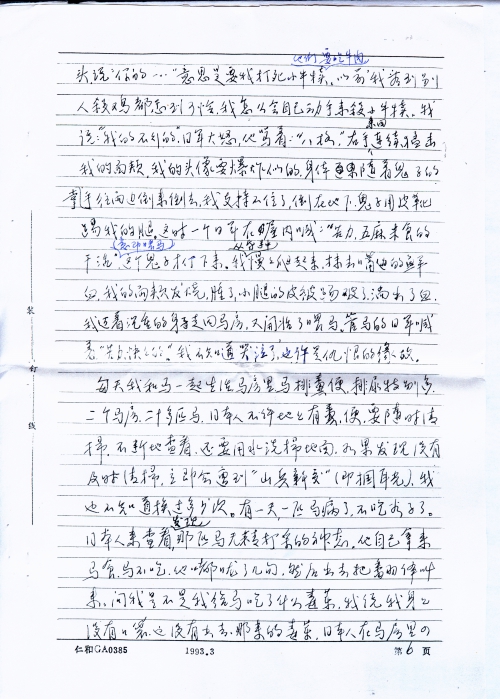 每天和马一起生活,马房里,马排粪便,排尿特别多,二个马房,二十多匹马,日本人不许地上有粪便,要随时清扫,不断地查看,还要用水洗扫地面,如果发现没有及时清扫,立即会遭到“山兵新交”(即掴耳光),我也不知道换过多少次。有一天,一匹马病了,不吃谷子了。日本人来查看,发现那匹马无精打采的神态。他自己拿来马食,马不吃,他嘟咙了几句,然后出去把翻译叫来,问我是不是我给马吃了什么毒菜,我说我身上没有口袋,也没有出去,[哪]来的毒菜,日本人在马房里四处查看,又抓起谷子和盐闵一闵,找不出什么,又翻看我的衣服,然后他不问了,他给汉奸翻译讲了一阵,汉奸对我说:你谁在马房,照看病马,晚上给马喂水。他随即拿来大柴和蜡烛,于是我也成了一匹马了,我日夜和马在一起,日本人每天给我吃二次饭(吃他们剩下的),每次用破碗盛半碗锅巴,放在马房门外的地上,没有筷子,用手抓着吃,没有水,和马一样,喝池塘里挑来的水,大小便也在这里,然后和马粪一起清出去。熬了几天,日本人叫来了他们的兽医,给马打了针,马的病好了,对我的惩罚结束了,晚上我才回到小屋里。